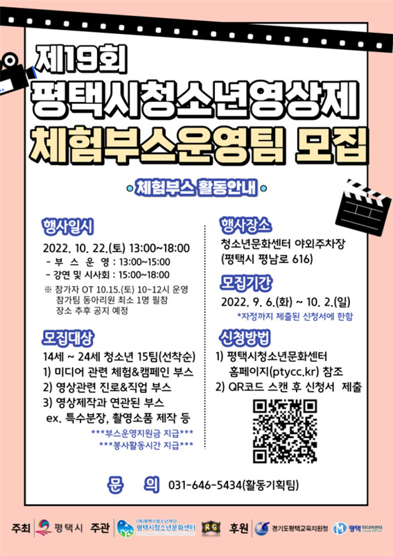 부스 운영 참가 신청은 평택시청소년문화센터 누리집(ptycc.kr) 공지사항에 게시된 링크 접속 또는 포스터를 참조해 QR 코드 스캔 후 작성 및 제출하면 된다.