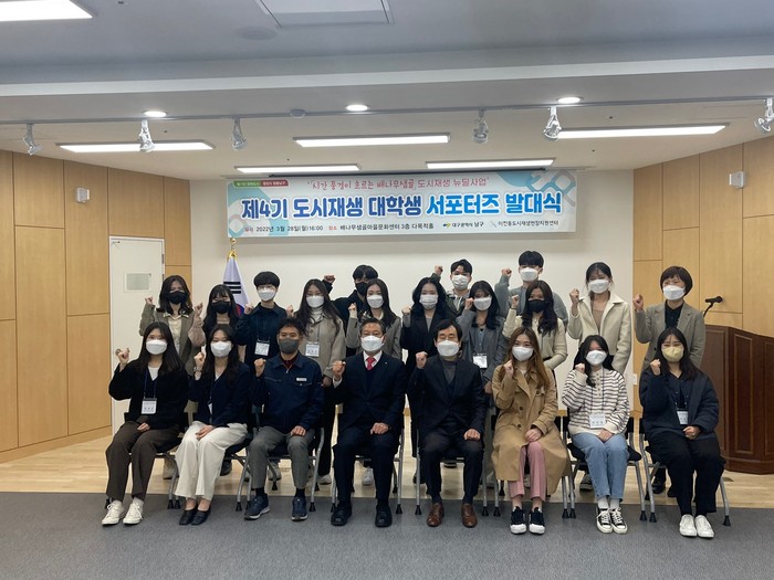 [로컬세계 박세환 기자]대구 남구청은 지난달 28일 이천동 배나무샘골 마을문화센터 3층 다목적홀에서 다양한 아이디어 발굴 및 뉴딜사업의 성공적 추진을 위해 도시재생 대학생 서포터즈 4기 발대식을 개최햇다고 1일 밝혔다.