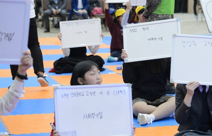 ▲‘지방자치 골든벨’에 참여한 학생들이 문제를 풀고 있다. 사진제공 세종시. |