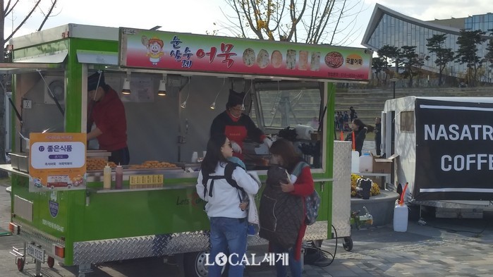 ▲날씨가 쌀쌀해지자 박람회를 찾은 시민들이 푸드트럭에서 따뜻한 국물과 어묵을 구입하고 있다. 오영균 기자. |