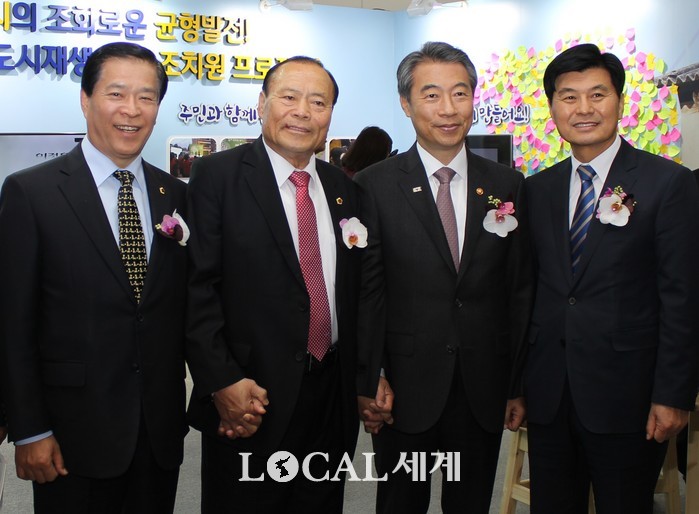 ▲제3회 지방자치박람회 개막식이 끝난 뒤 내빈들이 세종시 홍보관에 들러 기념촬영을 하고 있다. 왼쪽부터 박래학 서울시의장, 임상전 세종시의장, 정종섭 행정자치부 장관, 이춘희 세종시장. 오영균 기자. |
