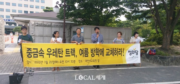 [로컬세계 조윤찬 기자]정의당 대전시당은 26일 오전 10시 30분 대전시교육청 정문 앞에서 ‘중금속 범벅 우레탄 트랙, 여름방학 중 교체 촉구’ 기자회견을 가졌다.