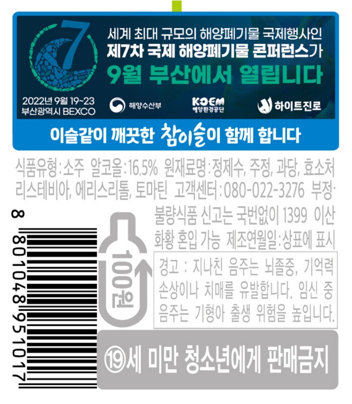 하이트진로는 해양환경 보호에 대한 관심을 환기시키고 콘퍼런스 참여를 높이고자 지난 11일 생산분부터 이번 보조라벨을 적용했다. 부산지역 내 참이슬 보조라벨에 ‘세계 최대 규모의 해양폐기물 국제행사인 제 7차 국제 해양폐기물 콘퍼런스가 9월 부산에서 열립니다’ 문구를 넣은 캠페인을 진행 중이다.