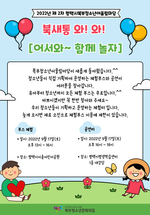 [로컬세계=김병민 기자]경기 평택시 위탁기관인 평택시북부청소년문화의집은 청소년이 주체가 되는 문화 활동 성장과 문화 예술 활동을 통한 청소년 중심의 건전한 청소년 문화교류의 장 형성을 위한 2차 북부청소년어울림마당을 오는 17일오후 1시부터 6시까지 이충어린이공원(체험부스)과 평택시평생학습센터 1층 대강당(공연)에서 개최한다.