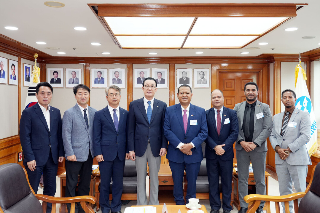 노동진 수협중앙회장(사진 왼쪽부터)이 로제리오 아라우주 멘돈사 동티모르 직업훈련고용청 국무장관과 수산인력 협력 방안을 논의한 뒤 기념촬영하고 있다.