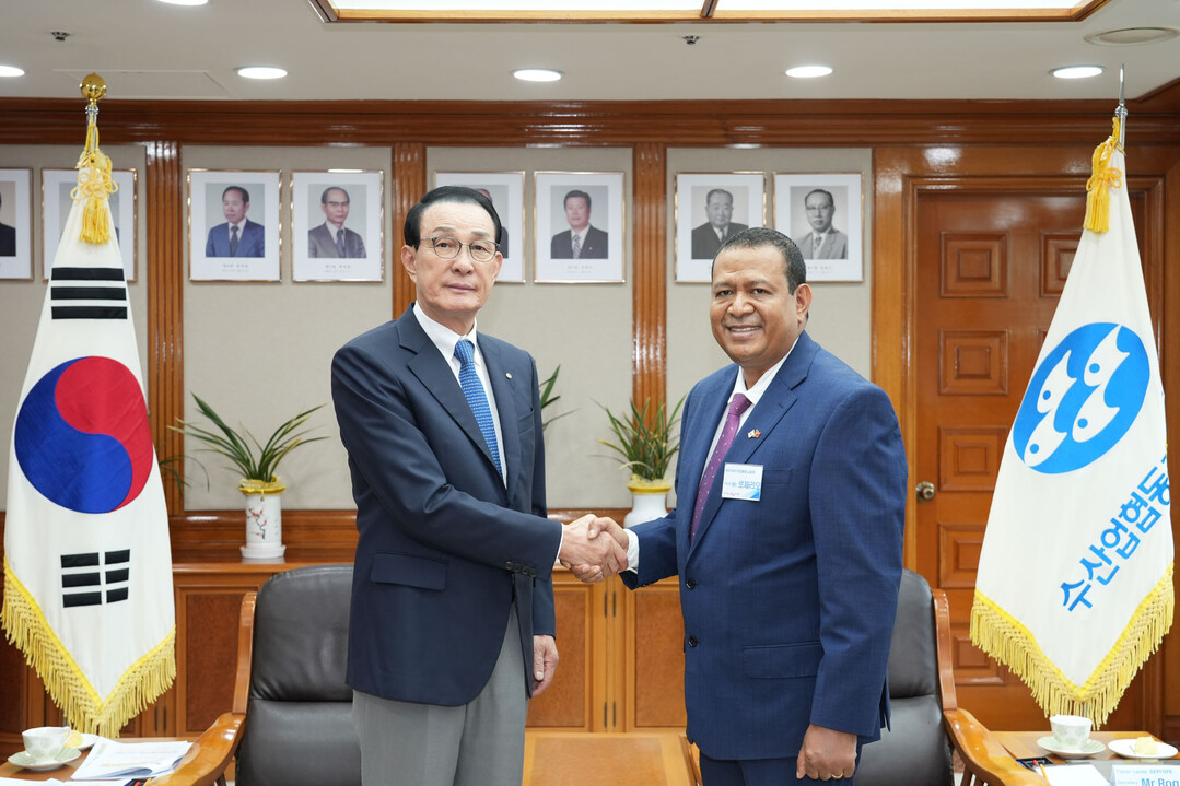 노동진 수협중앙회장은 최근 로제리오 아라우주 멘돈사 동티모르 직업훈련고용청 국무장관과 양국 간 수산분야 인력 교류 확대와 정보공유를 위한 협력 방안을 논의했다고 20일 밝혔다.
