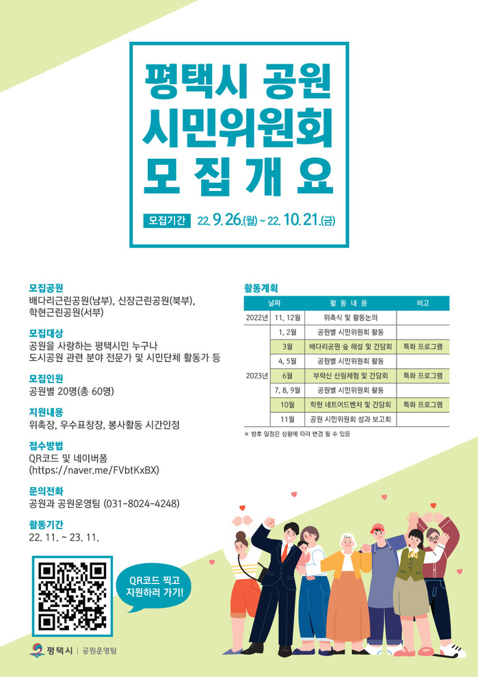 이번 평택시 공원 시민위원회는 오는 11월에 시작하여 2023년 11월까지 활동한다. 공원별 시민위원회는 자율적 논의를 통하여 해당 공원 내에서 봉사 활동을 하게 되며, 공원과는 ▲3월 배다리공원 숲 해설 ▲6월 부락산 산림체험장 ▲10월 학현네트어드벤처 체험 등 특화 프로그램을 제공한다. 이외에도 봉사시간 인정 및 우수 봉사자 표창 등의 혜택을 지원한다.