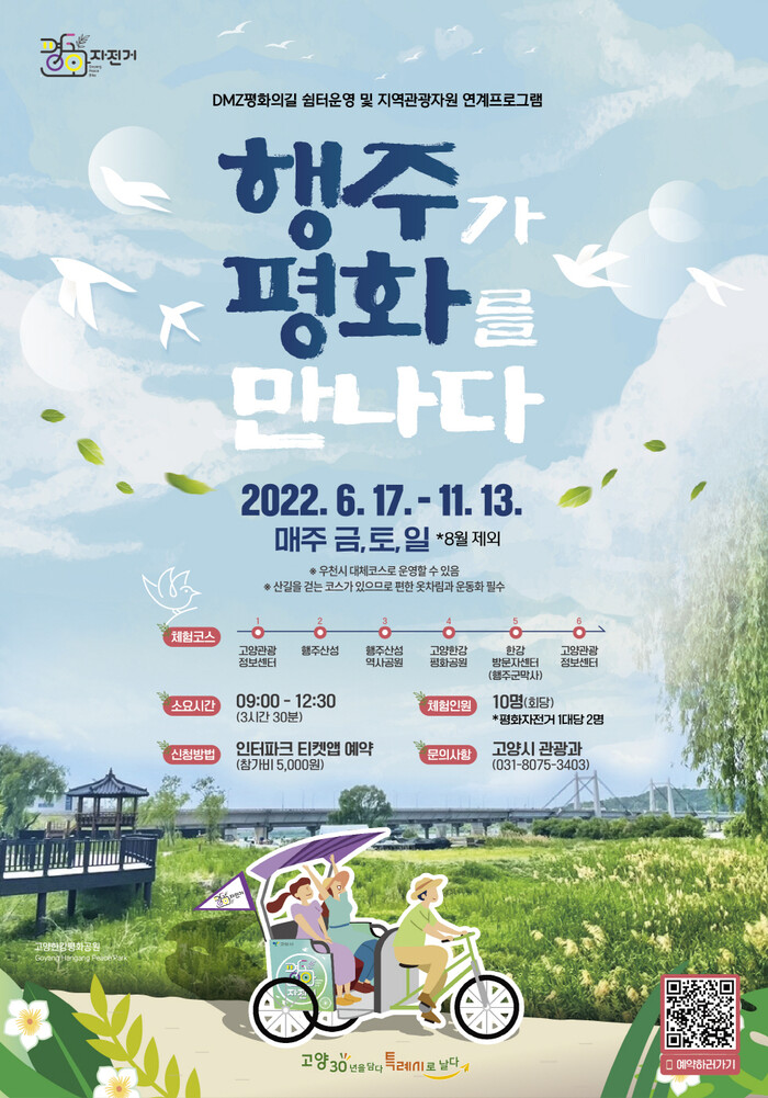 ‘행주가 평화를 만나다’는 6월 17일부터 11월 13일까지 매주 금, 토, 일 총48회 진행된다. 생태전문가와 동행하면서 고양시 한강하구의 생태‧역사‧평화를 체험하고 새롭게 조성된 고양한강평화공원에서 라이더가 태워주는 3인용 평화자전거를 타며 한강의 경치를 만끽할 수 있다.