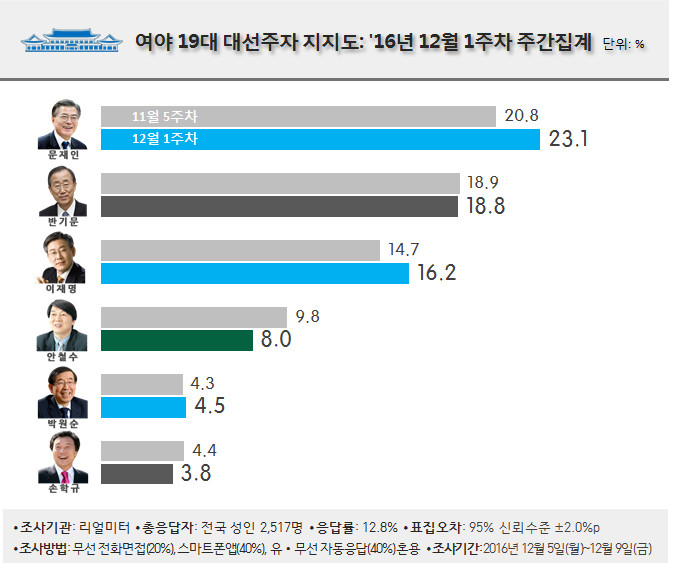 1위는 ‘박 대통령 탄핵 가결 시 즉각 퇴진’촉구를 주장한 문재인 더불어민주당 전 대표가 지난주 주간집계 대비 2.3%p 상승한 23.1%를 기록 지난 6월 2주차(24.1%) 이후 약 6개월여 만에 가장 높은 지지율을 나타내면서 6주 연속 선두 자리를 지켰다. 문 전 대표는 반기문 사무총장과의 격차를 4주 만에 다시 오차범위(±2.0%p) 밖에서 앞선 것으로 나타났다.