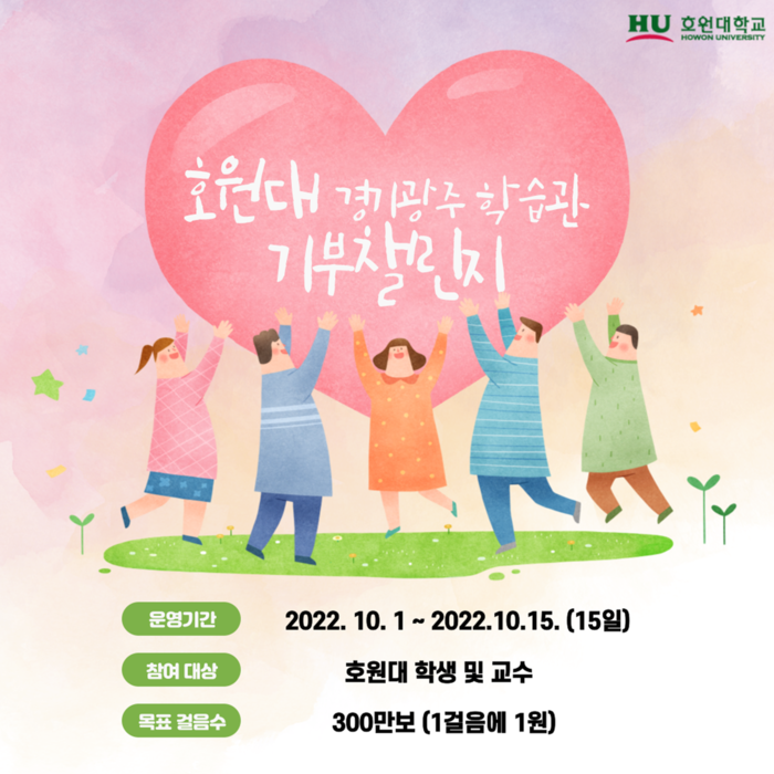 호원대학교 광주학습관은 오는 10월 1일 발대식을 시작으로 15일까지 15일간 모든 학생이 참여해 300만보를 목표로 기부 챌린지를 실시한다고 30일 밝혔다.