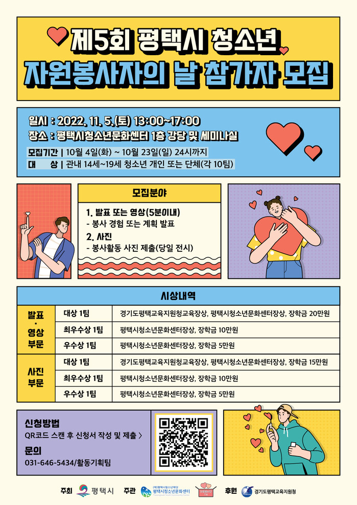 참여는 관내 14세~19세 청소년 개인 또는 단체 누구나 참가할 수 있으며, 자세한 내용 및 신청은 평택시청소년문화센터 누리집 공지사항에서 확인이 가능하다.
