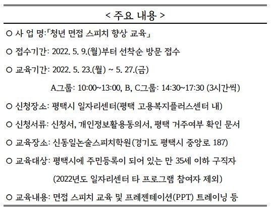 교육인원은 10명으로 평택시에 주민등록이 되어 있는 만 35세 이하 구직자 누구나 신청 가능하며, 9일부터 선착순으로 접수 받는다. 교육신청은 평택시민임을 증명할 수 있는 신분증이나 등본 등을 지참하여 평택시 일자리센터에 직접 방문해 신청하면 된다.