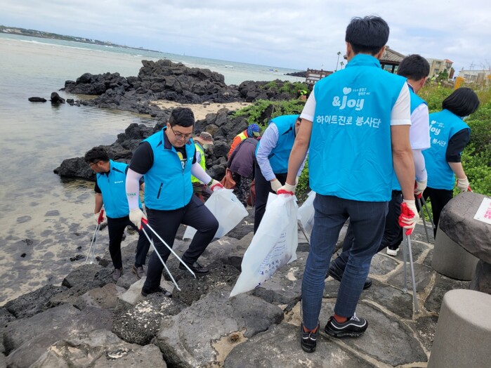 하이트진로(대표 김인규)는 지난 8일 제주도 서귀포시 표선면에 위치한 반려해변 표선해변의 환경 정화활동을 실시했다. 하이트진로 제주지점 임직원들은 서귀포시 바다환경지킴이와 함께 표선해수욕장과 해안도로 일대의 쓰레기를 수거했다.