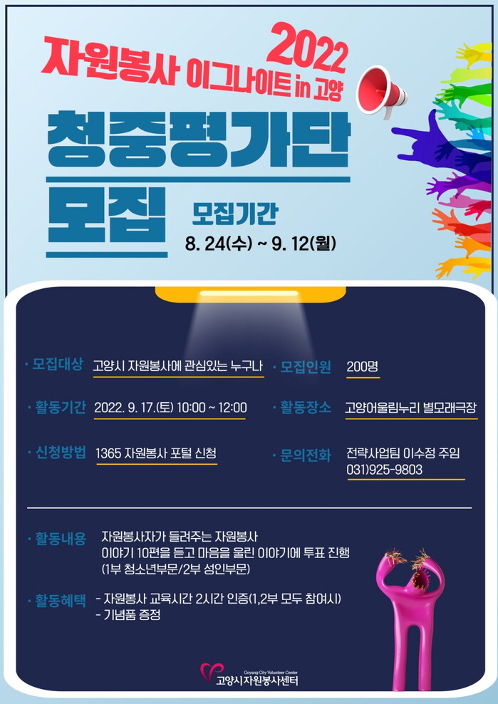 청중평가단은 고양시 자원봉사에 관심 있는 사람이라면 누구나 신청할 수 있으며, 본 대회 당일 자원봉사자의 이야기를 듣고 직접 평가에 참여할 예정이다.