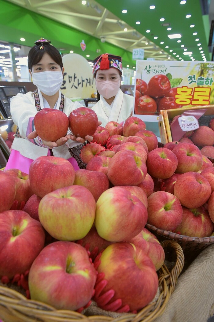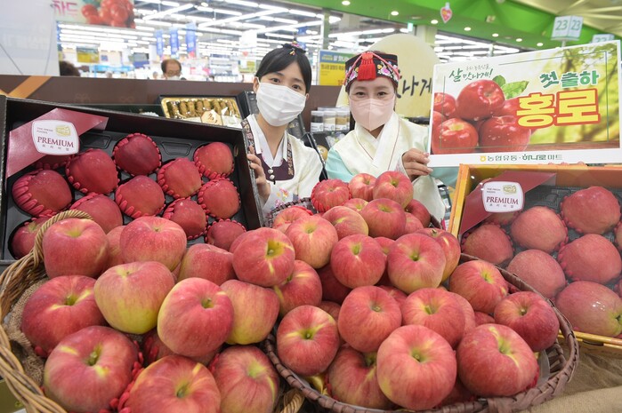 ▲14일(일) 서울시 서초구에 위치한 농협 하나로마트 양재점에서 모델들이 첫 출하된 추석 대표 사과의 품종인 ‘홍로’를 선보이고 있다. 농협유통 제공 |