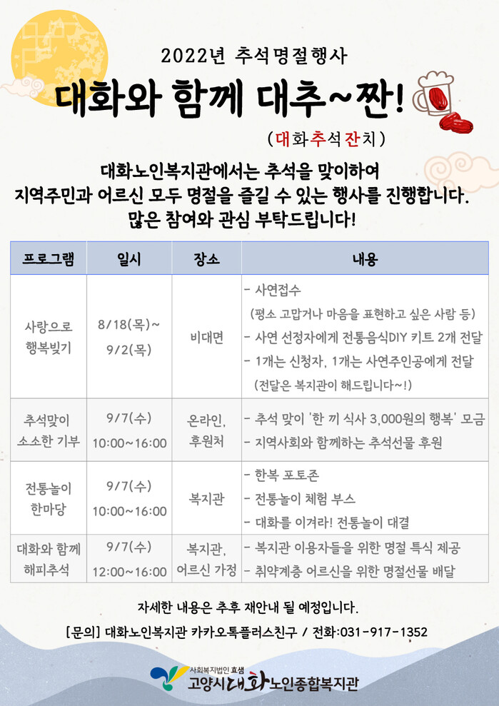 [로컬세계 = 이영원 기자]경기 고양시 대화노인종합복지관이 민족 대명절 추석을 맞이해 지역주민과 어르신이 함께하는 행사 ‘대화와 함께 대추~짠(대화추석잔치)’를 진행할 예정이다.