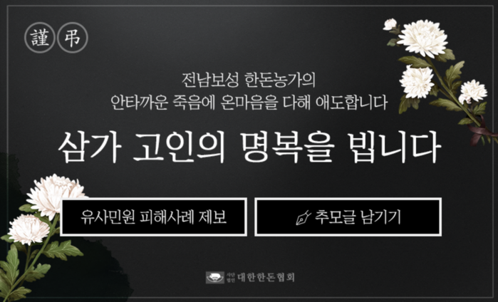 이에, 대한한돈협회는 지난 27일 성명서를 통해 애도의 뜻을 밝히고 이러한 비극이 더 이상 되풀이되지 않도록 대한한돈협회 홈페이지에 추모페이지를 마련, 전국의 한돈농가 및 국민들의 추모메시지와 유사한 민원피해사례를 접수 중에 있다.