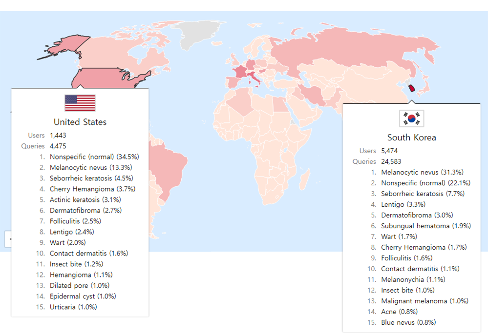 해당 플랫폼은 사용자들의 최근 한 달간 피부암·양성종양·검버섯·사마귀·모낭염 등 다양한 피부질환의 판독 기록을 국가별로 보여주며, 1시간마다 자동 업데이트된다.