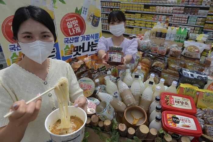 27일(수) 서울시 서초구에 위치한 하나로마트 양재점에서 모델들이 국산 쌀 소비촉진을 위한 “국산 쌀 가공식품(라이스에이드) 모음전”을 소개하고 있다. 살 맛나는 가격으로 준비한 “국산 쌀 가공식품 모음전”에서는 즉석밥, 쌀국수컵, 쌀부침가루, 고추장 등 국산 쌀 가공식품을 최대 50% 할인된 가격으로 판매한다.