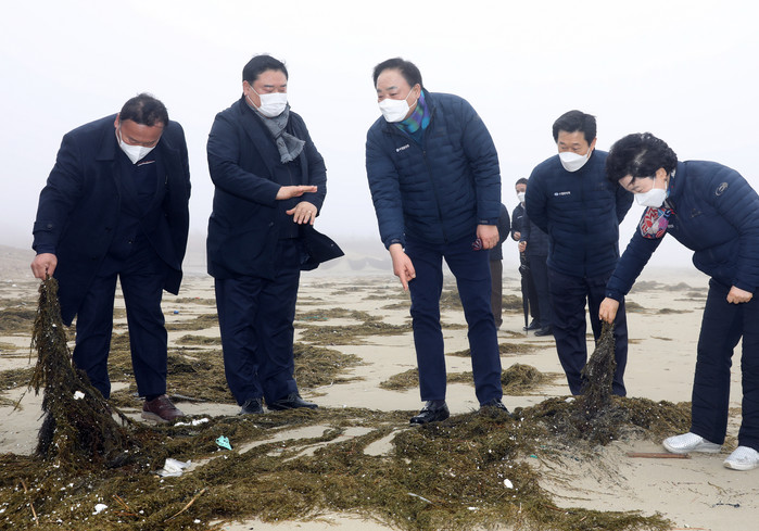▲임준택 수협중앙회장(사진 중앙)이 22일 전남 신안군 양산해변에서 괭생이모자반 피해 상황을 점검하고 있다.(수협중앙회 제공) |