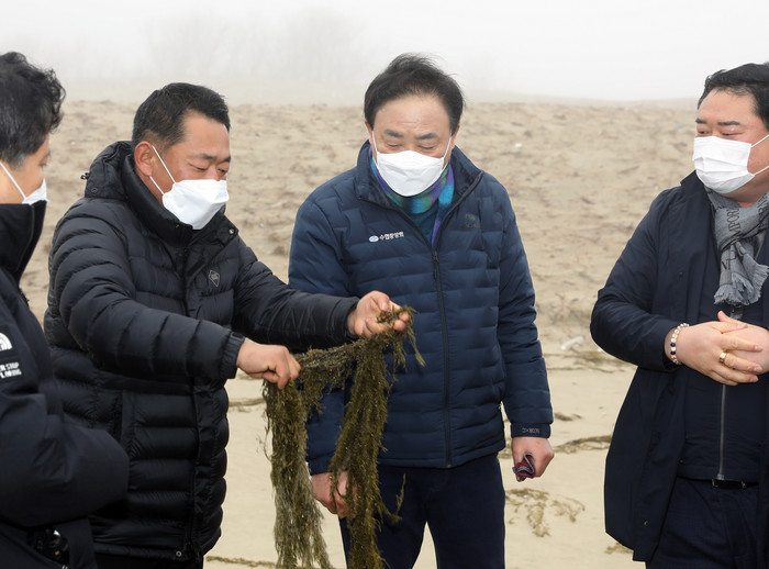 임준택 수협중앙회장이 22일 괭생이모자반 대량 유입으로 피해를 입은 전남 신안군 자은면 지역을 방문해 피해상황을 점검하고 어업인들을 격려했다.