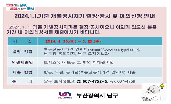 개별공시지가에 대해 이의가 있는 토지소유자 등은 이의신청서를 작성해서 5월 29일까지 남구청 토지정보과로 방문 및 우편 제출 또는 온라인(부동산공시가격 알리미)으로 제출하면 된다.