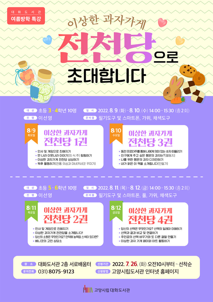 [로컬세계 = 이영원 기자]경기 고양특례시(시장 이동환) 대화도서관이 여름방학을 맞아 8월 9일부터 12일까지 어린이를 위한 프로그램 '이상한 과자가게 전천당으로 초대합니다'를 운영한다.