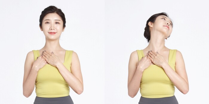 이 같은 상황 속 목디스크 예방을 위해 일상 속에서 가볍게 실천할 수 있는 건강법으로는 스트레칭이 있다. 의자에 앉아 쉽게 따라 할 수 있는 동작으로는 ‘사각근 이완 스트레칭’을 권한다. 우선 양손을 포개어 오른쪽 쇄골에 올려 고정한다. 이어 천천히 숨을 내쉬며 고개를 왼쪽으로 돌린 후 쇄골과 턱 끝이 멀어지도록 고개를 젖힌다. 쇄골을 고정한 채로 근육의 이완을 느끼며 15초간 자세를 유지한다. 동작을 3회씩 반복한 후 반대쪽도 동일하게 실시한다. 좌우 한 세트로 총 3회를 반복하면 목 근육을 부드럽게 이완하고 목 주변 혈액순환을 원활하게 하는 효과가 있다.