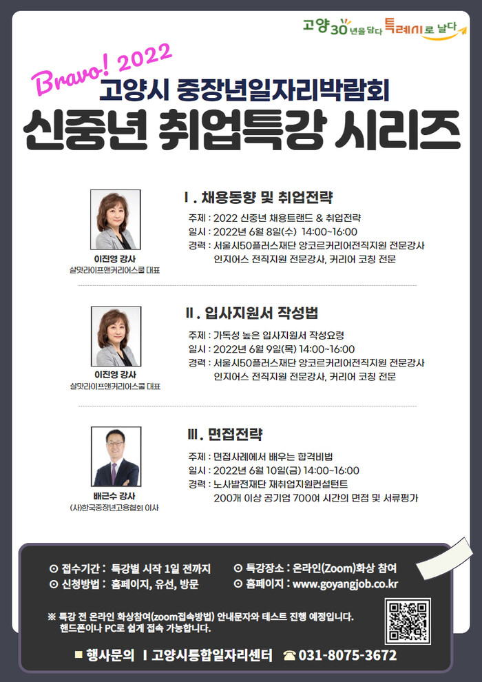 사전 신청은 고양시 중장년일자리박람회 홈페이지에서 가능하며 신청자에 한해 화상회의솔루션(ZOOM) 참여 안내문자를 발송할 예정이다.