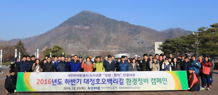 ▲ 대전마케팅공사는 생태관광 명소인 대청호오백리길에서 노사공동 환경정비 캠페인을 갖고 기념촬영을 하고 있다 |