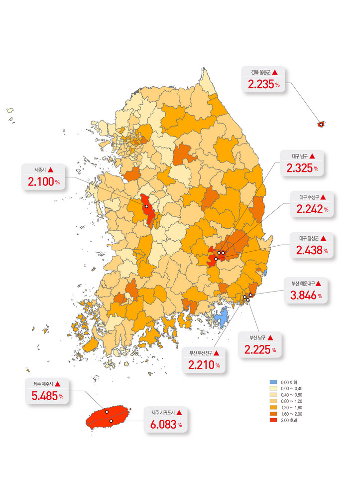 ▲전국 지가변동률 색인도. 자료제공 국토교통부. |