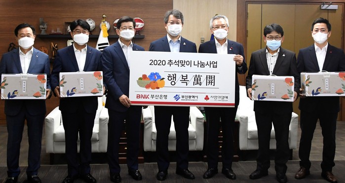 부산은행은 22일 오전 부산시청에서 부산지역 소외계층의 차례상 차림 지원을 위해 4억4000만원 상당의 ‘명절 복(福)꾸러미’를 전달하는 ‘2020 추석맞이 행복 만개(萬開) 나눔사업’ 행사를 진행했다.
