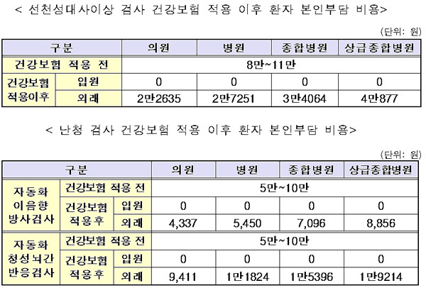 1일부터는 신생아 대상으로 선천성대사이상 및 난청 선별검사에 대해 건강보험이 적용되면, 선천성대사이상 및 난청 검사는 대부분의 신생아가 태어난 직후 입원 상태에서 검사를 받게 되는데 이 경우 환자 부담금은 없다.