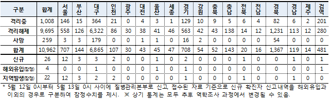 ◆지역별 확진자 현황 (5.13일 0시 기준, 1.3일 이후 누계)