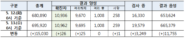 ◆국내 신고 및 검사 현황 (5.13일 0시 기준, 1.3일 이후 누계)