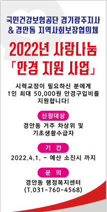 [로컬세계 김병민 기자]경기 광주시 경안동 지역사회보장협의체는 경제적 문제로 시력 교정이 어려운 저소득층을 대상으로 ‘사랑 나눔 안경 지원’ 사업을 추진한다고 6일 밝혔다.