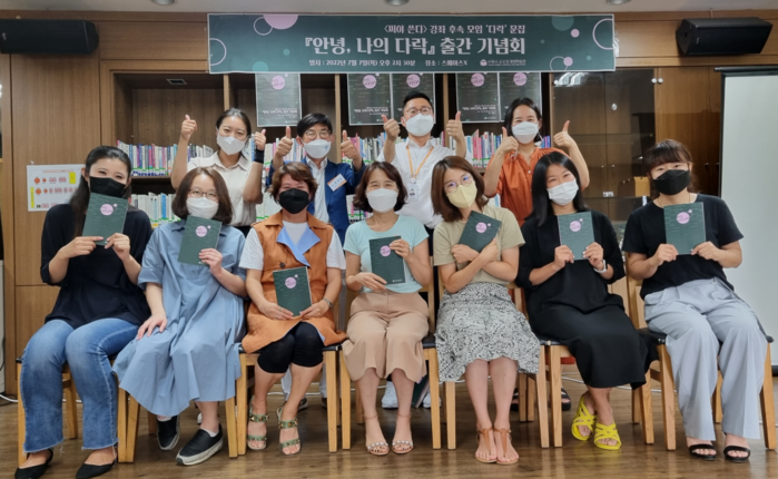 ▲7일 수원시글로벌평생학습관에서 열린 ‘안녕, 나의 다락’ 출간 기념회에서 관계자들이 기념 촬영을 하고 있다. |