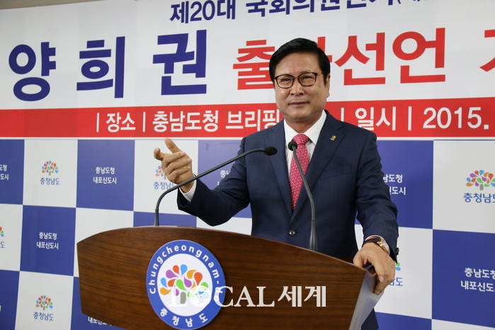 ▲양희권 페리카나 회장이 8일 충남도청 기자브리핑실에서 열린 기자회견을 통해 내년 총선 출마를 공식 선언하고 있다. 오영균 기자. |