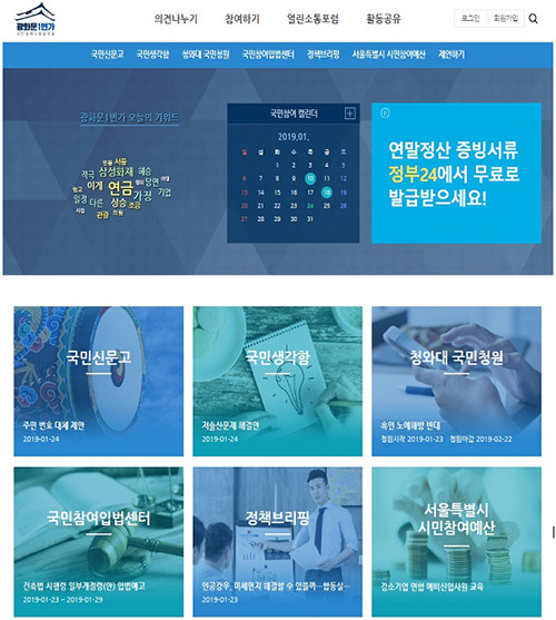행정안전부는 기관별로 운영되는 각종 국민참여 사이트를 통합·안내하고 정부 정책 제안과 토론이 가능한 정부대표 국민참여사이트인 ‘광화문1번가 국민참여플랫폼(온라인 광화문1번가)’을 31일 개시한다.