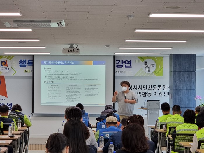 지난 5월 12일 안성공익활동지원센터 가치마당‧가치누리에서 진행된 행복마을관리소 역량강화 워크숍은 안성시시민활동통합지원단이 주관하여 경기행복마을관리소의 산파 역할을 한 경기연구원 최준규 연구원을 초청해 ‘행복마을의 필요성과 지킴이‧사무원‧행정의 역할’이라는 강연을 청취했다.