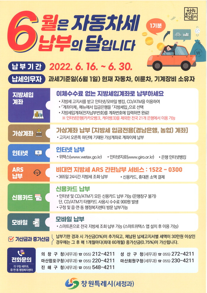 6월 정기분 자동차세는 과세기준일(6월 1일) 현재 창원시에 등록된 차량(자동차, 이륜자동차, 기계장비) 중 상반기 연납차량을 제외한 자동차등록원부상 소유자에게 부과되며, 연세액 10만원이하인 차량은 6월에 전액 과세된다.