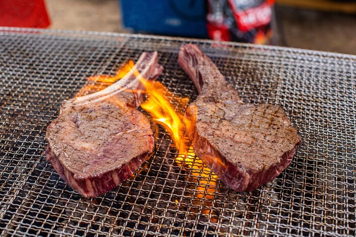 ▲캠핑장에서 즐기는 한우 BBQ. 지난 24일~26일, 강원도 양양 오토캠핑장에서 열린 '2022 고아웃 캠프'를 찾은 시민들이 한우자조금이 운영하는 한우 토마호크스테이크 시식 이벤트에 참여하고 있다. (사진=한우자조금 제공) |