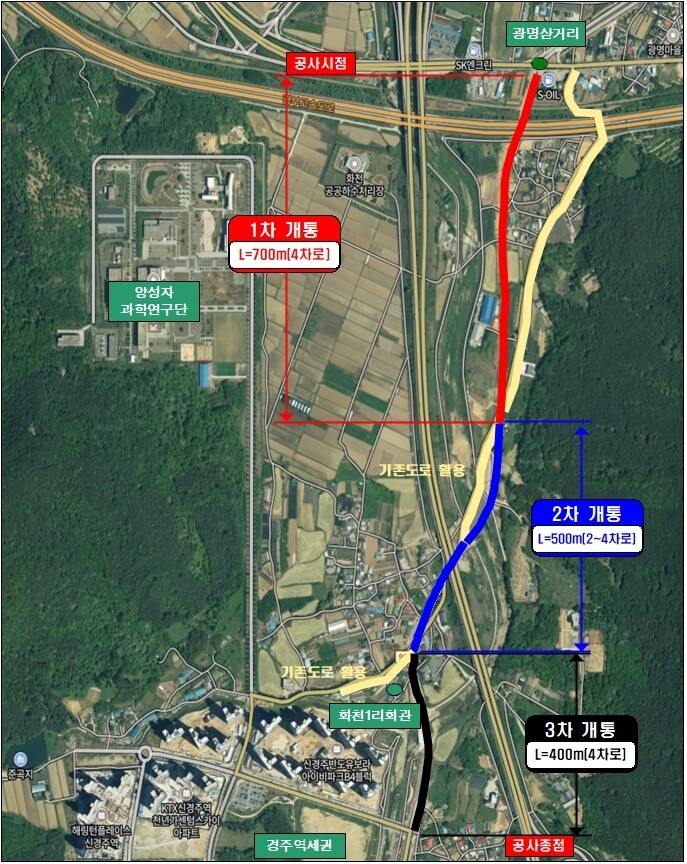 최혁준 경주시장 권한대행은 “광명~화천 도로는 신경주역세권과 도심을 잇는 핵심 기반시설”이라며 “단계별 개통으로 시민 불편을 줄이고 교통환경 개선 효과를 조기에 체감할 수 있도록 하겠다”고 말했다.