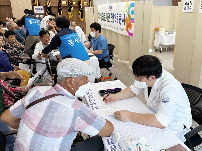 ▲청주자생한방병원 의료진이 진료소를 찾은 고령 농업인의 건강 상담을 진행하고 있다. |