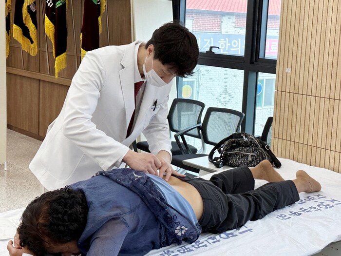 ▲청주자생한방병원 최우성 병원장이 진료소를 찾은 고령 농업인에게 침치료를 하고 있다. |