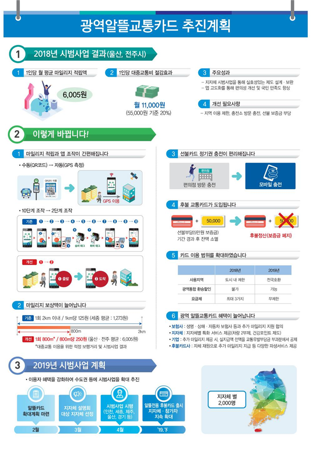 '광역알뜰교통카드' 사업은 지난해 세종, 울산, 전주시에서 시범사업을 거쳐 제기된 불편과 개선 사항을 반영해 카드 한 장이면 전국 어디서나 환승해 이용할 수 있도록 호환성을 높이고 번거로운 충전을 해야했던 기존 선불교통카드 방식에서 후불 카드로 바꿨다.