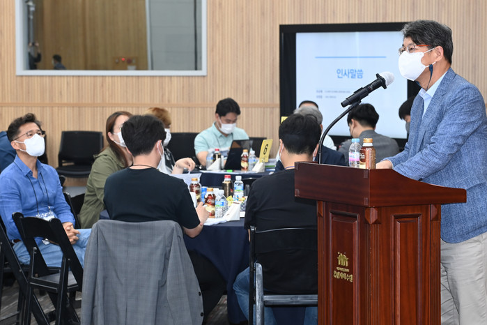 ▲유문종 수원시 제2부시장이 지난 21일 수원시 도시정책 시민계획단 원탁토론회에 참석해 인사말을 하고 있다. 수원시 제공 |
