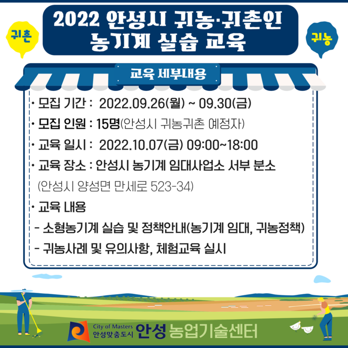 [로컬세계=김병민 기자] 안성시농업기술센터는 오는 9월 26일부터 30일까지 귀농귀촌인 대상 농기계 실습교육생을 모집한다.