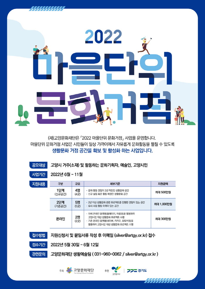 2022 마을단위 문화거점 사업의 공고는 고양문화재단 홈페이지를 통해 확인할 수 있으며 사업 신청 및 접수는 6월 12일까지 이메일을 통해 받는다.