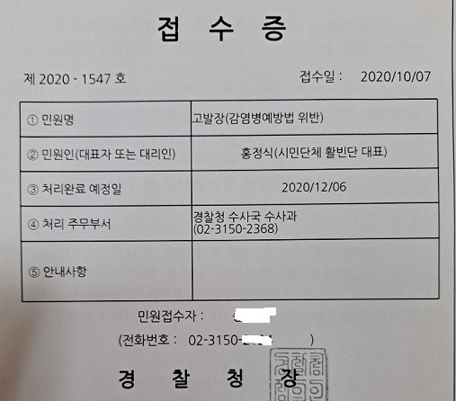 ▲홍정식 활빈단 대표가 7일 경찰청 본청에 제출한 고발장 접수증. 홍정식 대표 제공 |